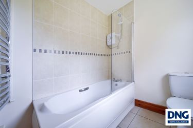Tiled Floor | White WC, WHB and Bath with Electric Shower Over Bath | Heated Towel Rail | Window to Rear