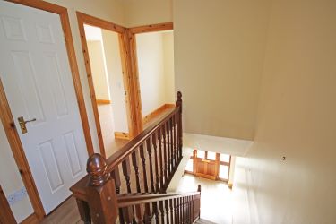 Carpet stairs. Window to side. Radiator. Hot press. Smoke alarm. Access to attic.
