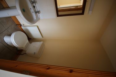 Tiled flooring. White wc, whb. Radiator. Electric shower in tiled cubicle. Extractor fan.