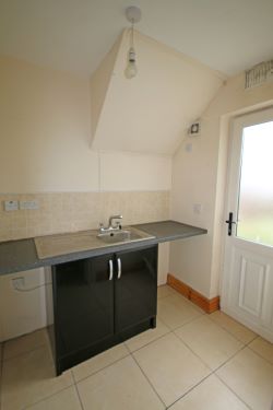 Stainless steel sink. Low level unit. Tiled flooring. Rear entrance door.