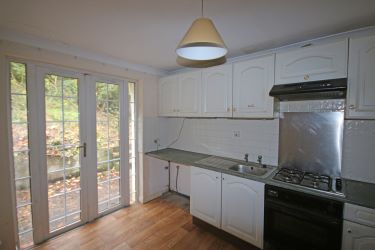 Lino flooring. High and low level units. Rear Patio doors to garde.
