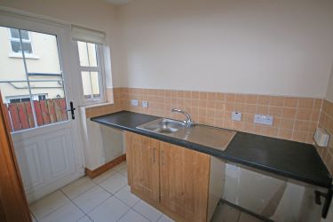 Tiled flooring. Window and door to side. Low level units with tiling above. Stainless steel sink. Radiator.