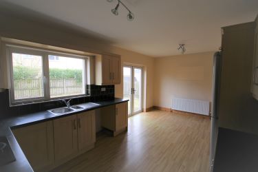Laminate flooring. Window and patio doors to rear. Kitchen units, both high and low levels tiled in between. Electric oven, hob and stainless steel extractor hood. Radiator. Stainless steel sink. Fridge freezer and space for dishwasher.