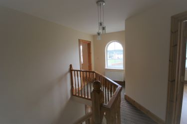 Carpeted stairs and landing. Arched window to front. Smoke alarm. Access to attic.