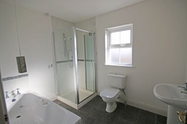 Tiled flooring. Bath. Electric shower in tiled cubicle. WC, WHB. Radiator.