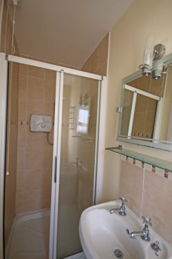 Electric shower. Tiled flooring. Tiled walls to shower cubicle. White wc, whb. Radiator.