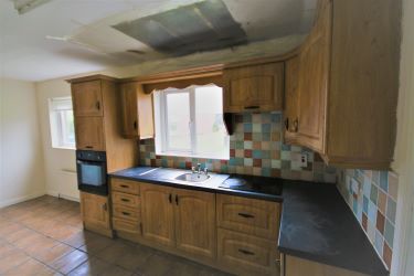 Tiled Floor. Two windows to rear. Radiator. High and Low level units, tiled in between. Electric Oven, Hob and Extractor Fan. Stainless Steel Sink.