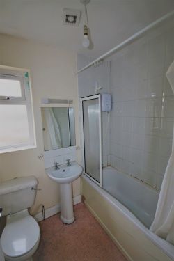 Lino Floor. Radiator. Window to rear. White WC, wash hand basin and bath with electric shower over.