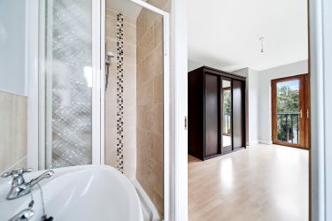 Tiled flooring. Radiator. Window to side. White wc, whb, power shower in tiled cubicle. Extractor fan.