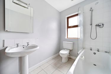 Tiled flooring. Radiator. Window to side. White wc, whb & bath with power shower over bath. Extractor fan.